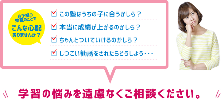 人見知りがちな娘が、自分から「行きたい」と言ってくれてよかったです。 - 今までこどもが学校の宿題をしなかったので悩んでいました。体験授業後は、塾で教えてもらったやり方で、自ら学校の宿題をするようになり勉強時間が増えました!また、あらためて子供の苦手な箇所に気づくことができました。